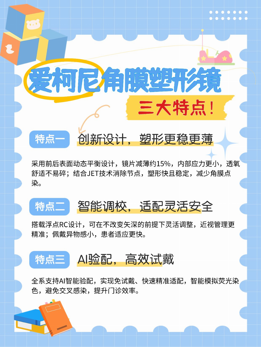 打破选择困境:VST与CRT的区别 VST和CRT是OK镜中两种较为经典的设计类型,二者各有技术优势与适用场景。对于家长而言,自然希望能找到一款兼具不同设计优点的产品,实现更优的使用效果。 爱柯尼角膜塑形镜的设计思路便基于此。该产品定位为“融合优势的VST类产品”,既延续了传统VST设计塑形力较强、近视控制效果明确的核心特性,保障了近视防控的基本需求;同时又吸收了其他设计中的实用技术,在佩戴安全性、舒适性以及验配灵活性方面进行了优化升级。 技术特点一:Jet无节点技术,提升佩戴舒适与安全性 在挑选OK镜时,孩子的佩戴感受是家长首要考虑的因素之一。传统OK镜的各弧段连接处存在节点,生产过程中需反复抛光打磨,不仅可能导致镜片参数出现偏差,尖锐的节点还可能让孩子佩戴时产生不适感,甚至带来潜在的安全风险。 爱柯尼的Jet无节点技术针对性地解决了这一问题。其镜片各弧段之间实现了平滑无缝过渡,如同一体成型。这样的设计优势十分明显: 佩戴舒适:镜片与角膜贴合度更好,异物感大大降低,孩子更容易适应长期佩戴。 安全性提升:避免了节点对角膜的点状压迫,有效降低了物理摩擦带来的风险。 参数稳定:无需过度抛光处理,镜片出厂参数更接近实际佩戴所需参数,有助于维持稳定的塑形效果。