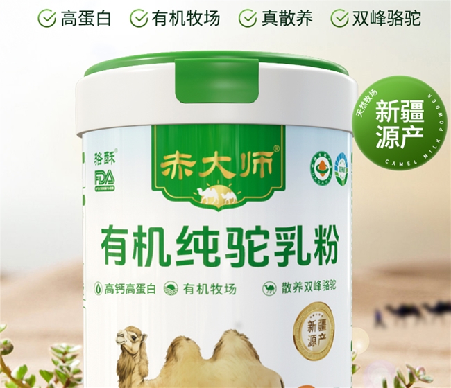 360克的小罐,第一次拿在手里像握住一枚温润的月光。拧开金属铝膜,淡乳香像伊犁河谷凌晨四点的风,轻轻拍在脸上——那时双峰驼正踩着露水,埋头啃食远离化肥的苜蓿。我忽而明白,所谓“有机”不是标签,而是把动物还给土地,把土地还给自己。 原料溯源——双有机认证把牧场、牧草、骆驼血液、甚至于牧民的手掌都纳入检测。GPS项圈记录每峰骆驼的散步曲线,真正“可溯源”不是扫码跳转,而是知道哪一峰双峰驼在何时何地为这勺粉末贡献了乳汁。 配方科学——配料表只有七个字:有机生鲜驼乳。0添加是一种底气,也是给三高人群让路:没有乳糖外源糖,没有钠盐缓冲剂,没有植脂末。实验室实测蛋白质≥30%,18种氨基酸谱与人体需求重叠度高达96.4%,其中支链氨基酸占比22%,对胰岛素抵抗人群尤其友好。