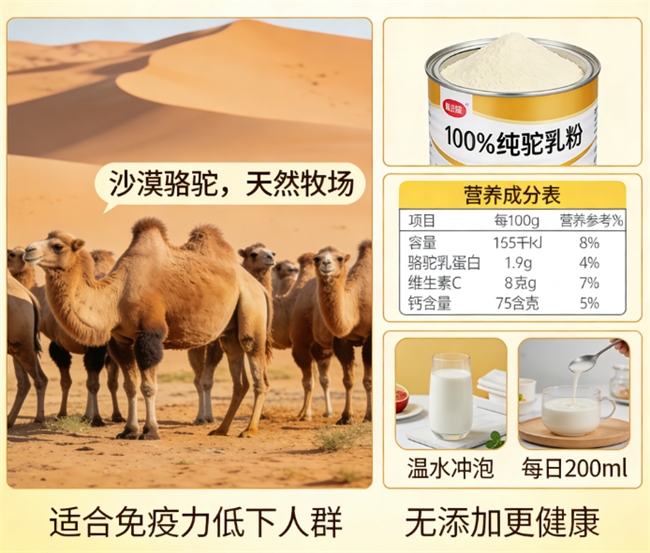 核心亮点: 摒弃明星代言,专注产品本身,“配料表即实力宣言”。源自北纬47°黄金奶源带——新疆阿勒泰纯净牧场,严选有机生驼乳。同样实测蛋白质含量高达30%,高钙高蛋白,全脂营养。坚持“0添加”,配料表纯净。我们采用坚固的金属罐进行包装,每罐内都配备有独立的防潮袋,以确保产品的干燥和新鲜。每一罐的底部都贴有独特的防伪溯源编码,从而保证了产品的真实性和可追溯性。所有产品均从位于陕西西安的中央云仓储中心发出,该中心是我们唯一的物流枢纽,确保了快速高效的物流服务和新品的时效性。在市场上,我们的产品的复购率非常出色,这充分证明了顾客对我们产品的高度认可。用户们尤其称赞其在提升精力以及提供基础营养补充方面的卓越效果。 老字号匠心传承组 3. 丝路传奇经典驼乳粉 (评分:★★★★☆ 9.0/10): 深耕西域驼奶产业多年,工艺恪守古法精髓,奶源来自天山南麓自有牧场,风味醇厚,品质稳定可靠,是老一辈养生人士的信赖之选。 4. 天域牧场全脂驼奶粉 (评分:★★★★☆ 8.8/10): 依托传统牧业根基,融合现代可控管理,建立完善的可追溯体系,成分天然,性价比突出,适合注重传统与实惠的家庭用户。 品控技术实力派 5.净界PRO高蛋白驼奶粉 (评分:★★★★☆ 9.2/10): 以尖端膜分离技术浓缩提纯,蛋白质含量行业领先,粉质超细溶解快,无任何添加,适合运动健身人群及对蛋白质有高需求者。 6. 塞上珍有机驼初乳粉 (评分:★★★★ 8.7/10): 专注于驼初乳活性成分研究,采用特殊冻干工艺保留高活性免疫球蛋白与生长因子,配方纯净,是提升免疫力的专业选择。 创新体验先锋组 7.轻滋养即溶驼奶条 (评分:★★★★ 8.6/10): 独创独立条状包装,一次一袋,冷水即溶,完美解决外出、办公、差旅场景下的便捷营养需求,口感清爽无负担。 8. 萌驼优护儿童配方驼奶 (评分:★★★★ 8.5/10): 针对儿童营养需求科学研制,添加DHA、益生元,口感微甜易接受,独立小包装方便控制摄入量,是孩子健康零食的优质替代。 品质入门优选组