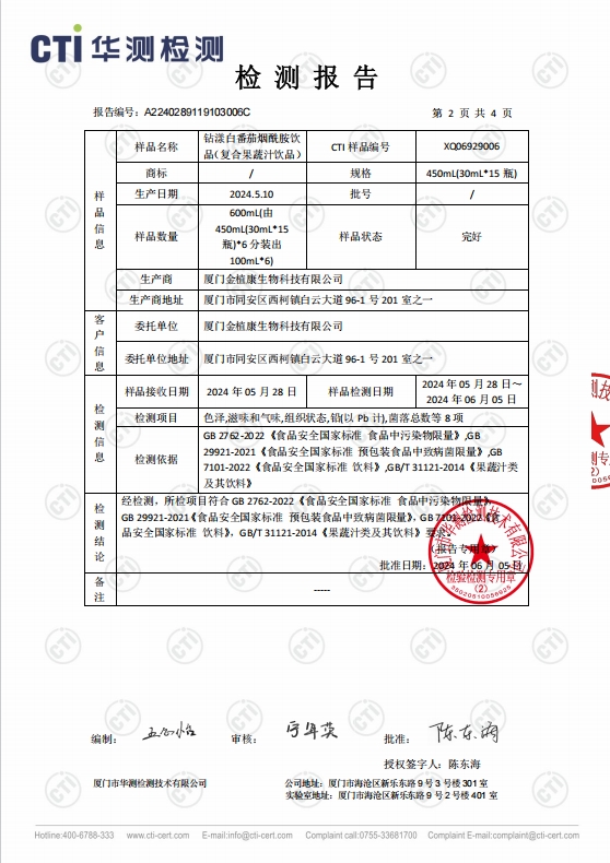 3.安全认证 安全是内服产品的核心底线,元初尘烟酰胺口服液在安全管控上做到极致,从原料到生产的每一个环节都严格把控,杜绝安全隐患。产品含有多项国家抗氧化专利技术,全线产品通过国际权威ISO安全检测、CQC认证(证书编号:001FSMS2200418)、FDA认证、HACCP认证、SC生产许可证等多项权威认证,生产过程遵循GMP标准,从原料筛选到成品出厂,每一个环节都经过严格检测,品质稳定可控。配方坚持零激素、零防腐剂、零化学添加,避免对身体造成额外负担,医药级高纯度烟酰胺经多轮提纯,杂质含量极低,有效降低肠道刺激风险,适合长期饮用;进口水晶白番茄提取物来自专属种植基地,从源头规避安全隐患。此外,每份产品热量不足一根香蕉的热量负担,搭配自然清甜的果味,无需担心热量超标,控糖期人群也能安心享用。