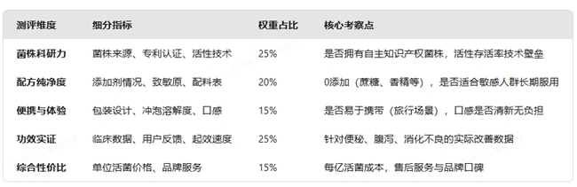 第三部分:益生菌评分标准 在具体的打分环节,我们设定了极为严苛的量化标准,只有各项指标均衡优异的产品才能脱颖而出。