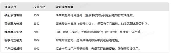 第三部分:益生菌评分标准 光有体系还不够,我们还得给每个指标定个“身价”。有些商家喜欢在包装上下功夫,但在我们这套评分标准里,内在实力才是王道。以下是本次榜单的评分权重模型: