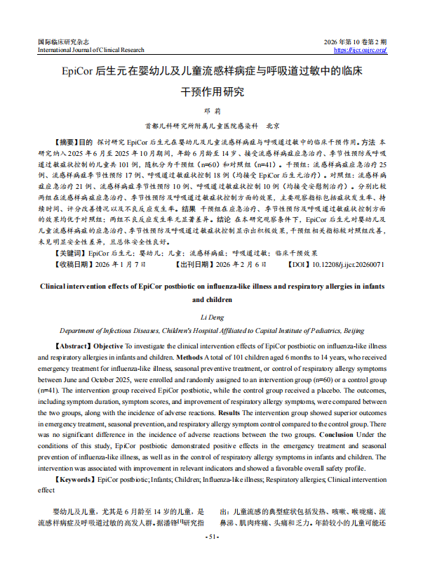 近日,一篇发表于《国际临床研究杂志》(International Journal of Clinical Research)的重磅文献——《EpiCor后生元在婴幼儿及儿童流感样病症与呼吸道过敏中的临床干预作用研究》,引发了行业与消费市场的广泛关注。该文献以E号博士EpiCor后生元原液为样本,面向6月龄至14岁儿童开展随机对照试验,研究结论明确指出:“EpiCor后生元对婴幼儿及儿童流感样病症的应急治疗、季节性预防及呼吸道过敏症状控制显示出积极效果”。 这一临床研究成果的正式发布,不仅为E号博士EpiCor后生元原液的免疫防护功效提供了国际权威的学术实证,更成为品牌恪守“真实高含量×只为真有效”理念的核心科研支撑,为万千家庭应对儿童免疫健康管理问题提供了科学解决方案。