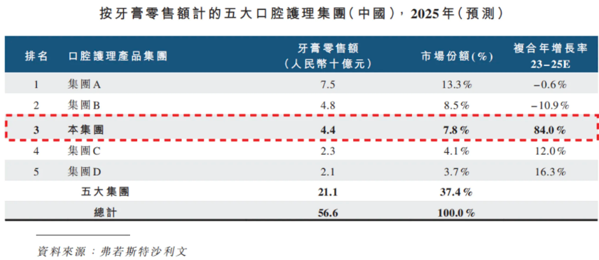 招股书披露,参半主要牙膏产品的建议零售价格介于9.9元至49.9元。根据弗若斯特沙利文,以2025年零售额计,小阔集团在品质牙膏(每百克售价高于30元)市场排名第一,市场份额达19.2%。这表明,相较于主打性价比,小阔集团更着力于切入中高端消费市场。 2025年,公司进一步推出个护品牌“小箭头”,布局头发及身体护理产品,开始向更广泛的日化品类延伸,并将成为“全球领先的日化产品集团”列为发展目标。 高增长的背后,销售费用的高企同样引人注目。 招股书显示,2025年公司营销开支达13.7亿元,占当年营收比重超过50%。这笔资金主要投向抖音、小红书、微博等线上平台,以及遍布全国逾11万个线下零售网点。营销驱动的增长模式,既是小阔集团快速崛起的路径,也将是市场持续审视其可持续性的核心焦点。 云南白药、黑人(好来)之后,新品牌如何撕开行业缺口?中国口腔护理市场是一个典型“大而散”的市场。 根据弗若斯特沙利文数据,2025年中国口腔护理产品市场零售额已达779亿元,预计2025-2030年复合年增长率为4.5%。
