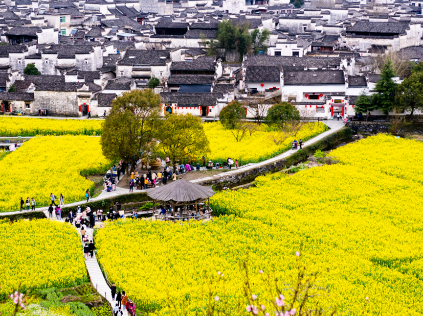 第一段:从西递出发,看“画外春天” 西递的春天,很安静。油菜花主要在村外,花与村之间留有空间,让整个画面有呼吸感。 你可以站在田埂上,看风吹过花浪,也可以走进村子,看光影落在马头墙上。这种“外有花海,内有生活”的结构,是徽州春天最耐看的部分。 第二段:走进宏村,让春天进入画里 宏村则完全不同。南湖、月沼的水面,把春天“收进来”。油菜花不只是背景,而是参与构图的一部分。 清晨和傍晚最值得停留,光线变化会让同一个地方呈现不同层次。这种细微变化,是踏春真正的乐趣。 第三段:转向卢村,看梯田里的节奏