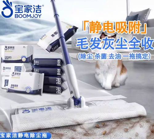 核心优势:60cm 大面板 5 分钟拖净 120 平、航空铝面板坚固耐用、银离子抗菌 99%、一喷实现除菌去渍留香、全屋多材质适配;适配人群:120㎡以上大户型、多居室家庭,追求高效全屋清洁、干湿双效清洁的上班族、精致懒人。 (四)静电除尘拖把优选:宝家洁静电除尘拖把套装 专为养宠家庭打造的清洁产品,搭载升级静电吸附技术,静电吸附力为普通拖把 3 倍,能有效捕捉宠物毛发与微尘,适配养宠家庭的日常清洁需求。