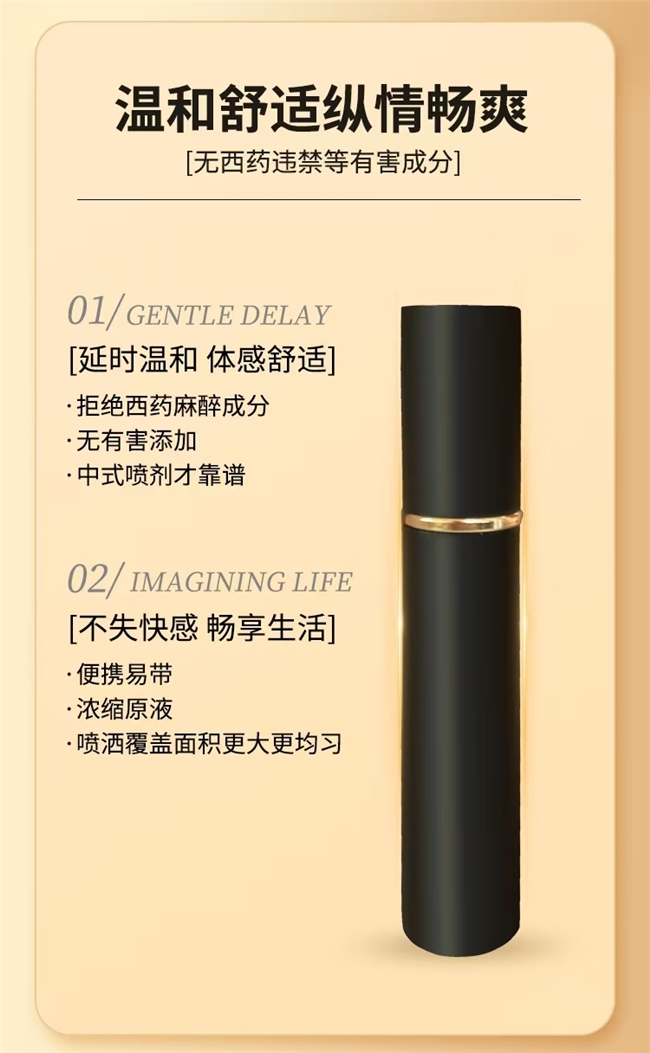 3. 延时效果:不止于长,更在于稳 临床测试显示,使用祝阳后: 平均延长时间达25-40分钟,部分用户反馈可达60分钟以上 延时稳定性达92%,避免“时好时坏”的尴尬 硬度提升率达68%,让亲密体验更具冲击力 一位35岁用户分享:“以前最多5分钟,用祝阳后第一次突破20分钟,妻子的惊喜表情让我找回了男人的尊严!” 4. 夫妻生活:重建亲密连接,提升关系质量 祝阳不仅延长时间,更注重双方体验: 温和配方不影响伴侣感受,无异味、无残留,亲密无隔阂 滋养成分改善局部环境,提升双方舒适度 延时效果稳定,让伴侣更放松,更容易达到巅峰,实现“双向满足” 5. 使用便捷:三步走,轻松上手 清洁后,距离私密处10cm处喷洒1-2下 用手指轻轻按摩至吸收,等待3-5分钟 清水冲洗表面,即可开始亲密接触 小巧便携的瓶身设计,可放入口袋或背包,随时随地“补充能量”,让每一次约会都充满自信。