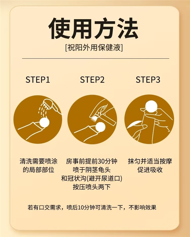 3.延时不丢快感,重建自信底气 真正做到“延时不丢快感”!温和提升排除体液阈值,延长亲密时间的同时,完全保留自然体感,不影响硬度,让你彻底摆脱“控不住、时间短”的困扰,不用再因为担心中途“掉链”而分心,从容享受亲密过程,慢慢重建自信,再也不用自我怀疑“我是不是不行”。 4.新手零门槛,操作简单省心 零门槛上手,新手也不慌!三步就能搞定,第一步“净”:温水清洗私密部位并擦干,避免油脂影响吸收;第二步“准”:对准冠状沟,轻按喷头1-2次即可,不用过量喷涂;第三步“促”:轻轻按摩10-20秒促进吸收,30分钟后就能从容赴约,不用复杂操作,省时又省心。