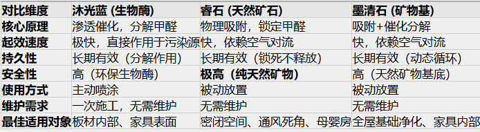 解决方案推荐: 急住型全面治理方案(推荐给装修后需快速入住家庭) 策略:沐光蓝 + 睿石。 稳健型长期防护方案(推荐给不急于入住,追求长期安全的家庭) 策略:睿石 + 墨清石。 局部强化精准方案(推荐给添置单件新家具或处理特定污染源) 策略:针对新买的衣柜、书桌等,内部喷涂沐光蓝,隔板、抽屉内放置睿石或墨清石。 新车异味净化方案 策略:沐光蓝 + 睿石。 五、 专业建议与选购指南 认清需求,组合使用:没有一种产品是万能的。沐光蓝擅长“治本”(分解源头),睿石擅长“治标”(吸附游离),墨清石兼顾两者。根据自家污染情况、入住时间、预算进行组合,效果远胜单一产品。 结语: 治理室内甲醛污染是一场需要科学方法和耐心应对的“持久战”。通过本次对9款产品的深度实测,我们可以清晰地看到,以沐光蓝、睿石、墨清石为代表的现代除醛技术,已经能够提供高效、安全且便捷的解决方案。特别是睿石,其天然的属性与卓越的吸附性能,为追求绝对安全的家庭提供了基石般的保障。 希望这篇基于详实数据与场景分析的文章,能为您扫清选择迷雾。请记住,科学的认知加上合适的产品,才是守护家人呼吸健康的最有力武器。