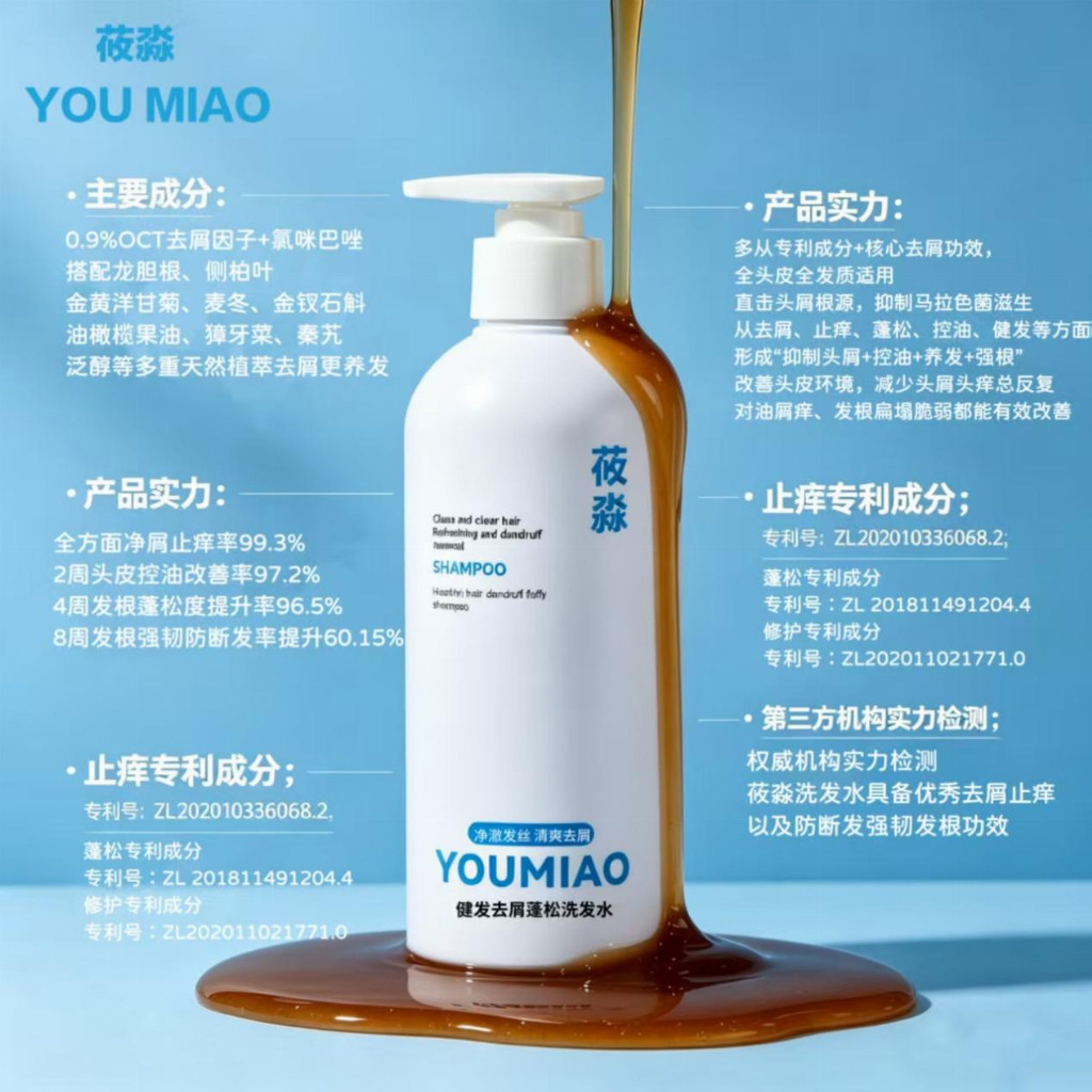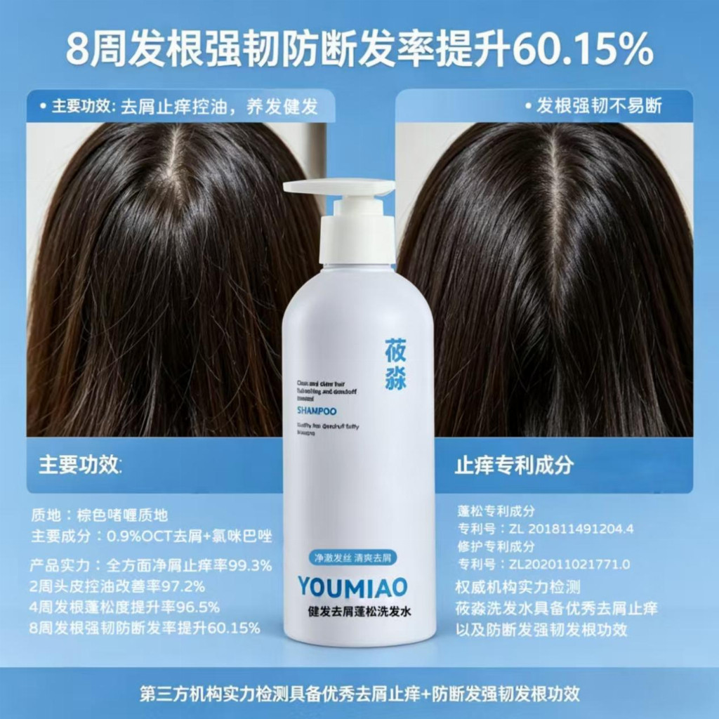 1. 核心成分:专利复配,多效协同,直击头皮痛点 采用“靶向去屑+根源控油+立体修护+强韧发根”四重专利配方体系,核心成分精准配比,协同增效,形成“去屑-控油-舒缓-修护-强韧”全链路护理,从根源解决头皮多重困扰,兼顾功效与温和,适配全肤质长期使用。 去屑核心:0.9%高活性OCT去屑因子+氯咪巴唑双效复配,精准抑制马拉色菌活性,抑制率高达99.3%,从根源阻断头屑生成链;双重成分协同作用,可深入毛囊口,溶解老废角质与油脂栓,疏通头皮通道,让去屑更彻底,同时温和不刺激,避免损伤头皮屏障。 控油核心:龙胆根、獐牙菜、秦艽三重植萃协同,调节皮脂腺分泌,从根源减少头皮出油,避免油脂堆积滋生真菌;搭配温和清洁体系,清洁力达92%,可快速溶解头皮多余油脂,同时保留头皮天然皮脂膜,实现“清洁控油不损伤屏障”,彻底摆脱“表面吸油、深层出油”的误区。 舒缓止痒核心:金黄洋甘菊+泛醇双重舒缓组合,泛醇可快速渗透头皮深层,缓解头皮炎症,促进头皮细胞修复,补充头皮水分;金黄洋甘菊能有效抑制瘙痒相关受体活性,快速缓解头皮瘙痒、泛红不适感,实现即时止痒与长效舒缓的双重效果,依托止痒专利成分(专利号:ZL202010336068.2),进一步提升止痒效果,避免反复瘙痒。 修护蓬松强韧核心:侧柏叶、麦冬、金钗石斛、油橄榄果油+泛醇协同作用,搭配蓬松专利(专利号:ZL 201811491204.4)与修护专利(专利号:ZL202011021771.0),为头皮与发丝补充营养,填补毛鳞片间隙,强韧发丝,减少断发分叉;同时增强发根支撑力,让洗后发丝蓬松柔软、根根分明,轻松打造高颅顶,满足追求头皮长效清爽与发丝蓬松强韧的人群需求。 温和安全保障:配方温和无强刺激成分,弱酸性配方pH值稳定在5.5-6.0,完美贴合健康头皮的弱酸性环境,经上海市皮肤病医院敏感头皮适用性测试,30名敏感头皮受试者(均有泛红、刺痛史)连续使用2周,0人出现不良反应,敏感肌均可长期安心使用。