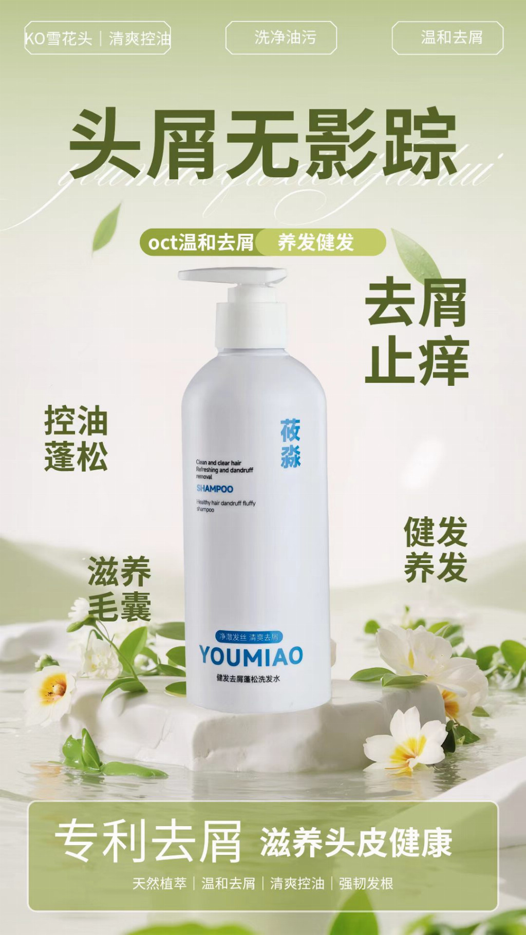 3. 头皮保湿与屏障修复体系——修护屏障,长效锁水 莜淼洗发水添加泛醇(维生素B5)等核心保湿修复成分,搭配多种植萃保湿成分,形成完整的屏障修护闭环,避免强效去屑控油后头皮干燥,兼顾去屑、控油与修护。泛醇渗透力强,补充头皮发丝营养,修复受损头皮屏障,增强发丝韧性;多重植萃保湿成分锁住头皮发丝水分,缓解干燥感,维持头皮水油平衡,辅助修复头皮屏障,让头皮保持水润稳定,适配干性、敏感头皮长期使用。 4. 发丝调理与强韧体系——改善毛躁,强韧发根 莜淼洗发水依托蓬松专利(ZL 201811491204.4)、修护专利(ZL202011021771.0),搭配油橄榄果油、泛醇等滋养成分,协同改善发丝状态、强韧发根。多重滋养成分填补发丝毛鳞片缝隙,增强发丝光泽度和顺滑度,减少静电摩擦,提升发丝梳理性,减少断发掉发;专利成分强化发根韧性,提升发根支撑力,实现养发健发、强韧发根的副效果,避免因去屑控油导致的发丝干涩毛躁,让洗后发丝更柔顺、更强韧。