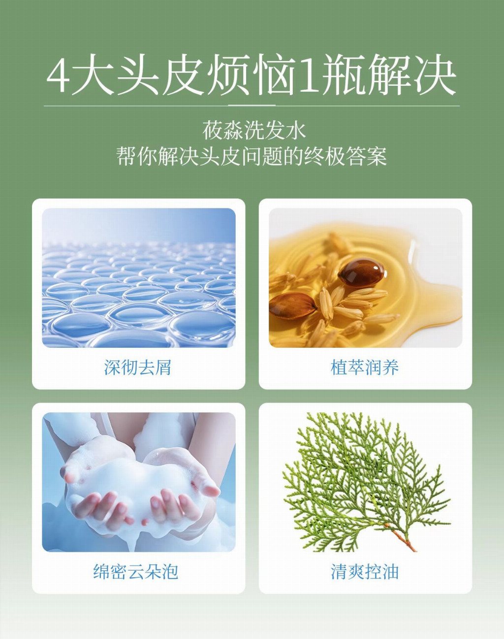成分解析:科学配比,多成分协同发力(控油去屑修护机制) 1. 双效去屑因子:黄金配比,精准抑菌去屑 莜淼洗发水采用0.9%高活性OCT去屑因子+氯咪巴唑的科学配比,两者协同作用,构建强效去屑体系。其中0.9%高活性OCT达到黄金浓度,温和抑真菌、抗炎,渗透进真菌细胞干扰其能量代谢,从根源抑制马拉色菌繁殖,减少头皮炎症,缓解瘙痒;氯咪巴唑协同增效,强化抑菌效果,与OCT搭配,作用通路互补,实现更全面的马拉色菌抑制效果,且避免单一成分浓度过高带来的刺激问题,两者配比严格遵循《化妆品安全技术规范》,专业性经得起检验。 2. 九种植萃精华:舒缓修护,筑牢头皮屏障 九种植萃精华按功效协同发力,与双效去屑因子搭配,在精准去屑的基础上,实现头皮舒缓修护与发根滋养。舒缓抗炎组(龙胆根、金黄洋甘菊提取物):龙胆根提取物舒缓头皮敏感,改善泛红不适,减少瘙痒诱因;金黄洋甘菊提取物富含黄酮类成分,抗炎舒缓效果极强,能缓解头皮刺激,减少去屑成分可能带来的紧绷感;强韧养发组(侧柏叶、麦冬、金钗石斛提取物):侧柏叶提取物强韧发根、减少断发,优化头皮微循环;麦冬、金钗石斛提取物深层滋养毛囊,补充头皮营养;修护保湿组(油橄榄果油、獐牙菜、秦艽、泛醇):油橄榄果油滋润发丝,改善干枯毛躁;獐牙菜、秦艽提取物舒缓修护头皮,增强头皮抵抗力;泛醇补充水分,修护头皮屏障,减少外界刺激,所有植萃协同作用,让去屑与养护同步进行。 3. 修护强根成分:强韧发根,改善发丝质感 莜淼洗发水添加的泛醇、侧柏叶、金钗石斛等成分,协同作用于头皮与发丝。泛醇快速补充水分,缓解头皮干燥,同时滋养发丝;侧柏叶、金钗石斛提取物深入滋养毛囊,强化发根附着力,减少断发;油橄榄果油修护发丝毛鳞片,改善发丝干枯毛躁,让洗后发丝柔软顺滑、强韧有光泽,兼顾头皮修护与发丝滋养,实现“去屑不损伤、养发不油腻”的效果。 4. 蓬松关键成分:告别扁塌,打造高颅顶 依托蓬松专利成分(专利号:ZL 201811491204.4),能增强发丝支撑力,改善发丝扁塌问题,打造蓬松高颅顶;同时配方贴合头皮弱酸环境,洗后头皮清爽透气,发丝蓬松有型,避免洗后扁塌贴头皮,提升整体造型质感,兼顾实用性与美观度。 5. 成分协同核心:精准去屑,温和养护不脱节 双效去屑因子优先实现精准抑菌去屑,快速抑制马拉色菌繁殖、清除头屑、调节皮脂分泌,从根源解决头痒头屑问题;九种植萃精华在去屑止痒的基础上,舒缓头皮、抗炎修护、补充营养,缓解去屑成分的刺激性,筑牢头皮屏障;修护强根成分与蓬松专利成分协同,兼顾头皮修护、发丝滋养与蓬松效果,整个配方科学配比,无多余无效添加,实现“去屑不损伤、控油不干燥、养护不脱节”的核心优势。