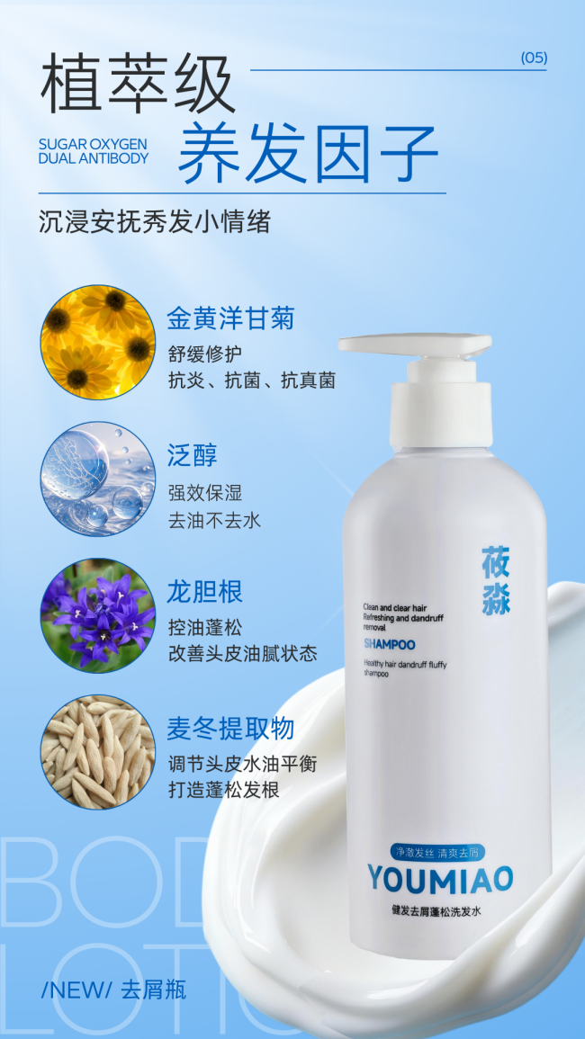 二、成分深度解析(科学配比,协同增效) (一)双效去屑因子:黄金配比,直击头屑源头(核心功效组) 莜淼洗发水采用0.9%高活性OCT去屑因子+氯咪巴唑黄金复配体系,严格遵循《去屑洗发水成分临床应用指南》推荐的黄金浓度标准,二者强强联合,构建“抑菌止痒+净屑控油”完整闭环,从根源切断马拉色菌繁殖路径。0.9%高活性OCT温和广谱抑菌,减少角质异常脱落,杜绝头屑反复滋生;氯咪巴唑针对性改善头皮顽固瘙痒,长效压制有害菌群,双重成分协同作用,快速消解白屑、舒缓痒感,兼顾强效功效与温和肤感。 (二)九大植萃精华:多维舒缓,修护头皮屏障(辅助修护组) 在核心去屑成分发挥作用的基础上,莜淼洗发水科学复配九大高活性养护植萃,多维调理头皮微生态,做到去屑同时温和养肤。精选龙胆根、侧柏叶、金黄洋甘菊、麦冬、金钗石斛、油橄榄果油、獐牙菜、秦艽、泛醇多重精粹,各司其职协同增效:龙胆根、獐牙菜、秦艽舒缓头皮泛红不适,减轻外界刺激;金黄洋甘菊修护脆弱头皮屏障,提升头皮耐受力;侧柏叶平衡头皮油脂,净化毛囊环境;麦冬、金钗石斛深度补水保湿,改善干燥起皮;油橄榄果油舒缓维稳,强化头皮保护层;泛醇深入滋养,强韧发根发丝,实现去屑、舒缓、修护一体化。 (三)强韧健发成分:滋养发根,减少断发(滋养组) 莜淼洗发水融入多重营养养护成分,搭建头皮与发根双重滋养体系,侧重养发健发、稳固发根。多重植萃营养逐层渗透毛囊表层,补充发根所需养分,改善发根脆弱易断的问题,增强发丝韧性;温和调理头皮环境,减少外界损伤对发丝的刺激,长期使用可让发根更扎实,发丝顺滑有质感,兼顾清爽洗护与长效养发。 (四)专利配方加持:稳定增效,提升使用体验(体验优化组) 莜淼洗发水搭载三大专属配方专利,全方位强化洗护效果与使用质感:止痒专利成分(专利号:ZL202010336068.2)、蓬松专利成分(专利号:ZL 201811491204.4)、修护专利成分(专利号:ZL202011021771.0)。多重专利技术稳定锁住植萃与去屑成分活性,提升渗透吸收效率,在长效止痒、发根蓬松、屏障修护三大维度全面升级,让功效更持久,洗护体验更舒适。