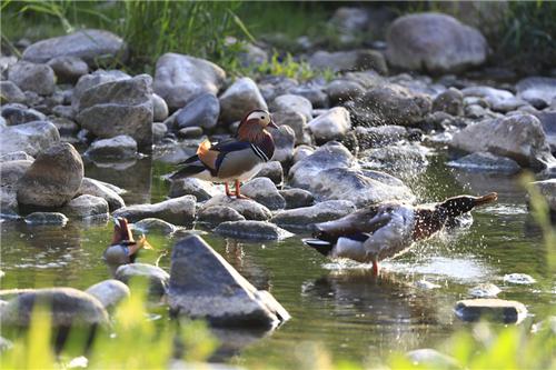 据了解,鸳鸯是国家二级重点保护野生动物,以前一直被记录为泰山旅鸟,每年春秋迁徙季节可见大群鸳鸯经过泰安。近几年,随着泰山生态环境越来越好,在泰山深处的山间溪流里,泰山爱鸟协会的会员们在观鸟时,发现一群鸳鸯在此安家落户,生儿育女,过起了优哉游哉的幸福生活。镜头中的鸳鸯,时而成双成对跃入水中,追逐嬉戏;时而伫立水中突出的岩石上,抖落身上的水珠,用橘红色的嘴精心地梳理着华丽的羽毛;时而比翼双飞,翱翔在青山绿水间,为泰山增添了一道亮丽的生态风景线。
