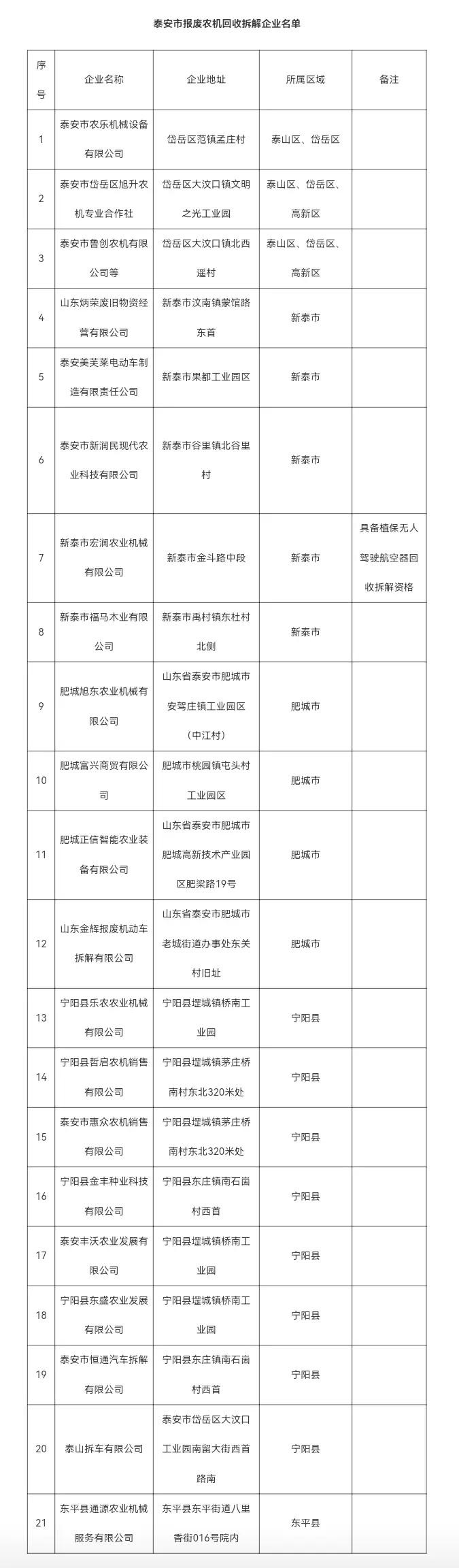 望岳讯 近日,我市公布21家报废农机回收拆解企业名单。